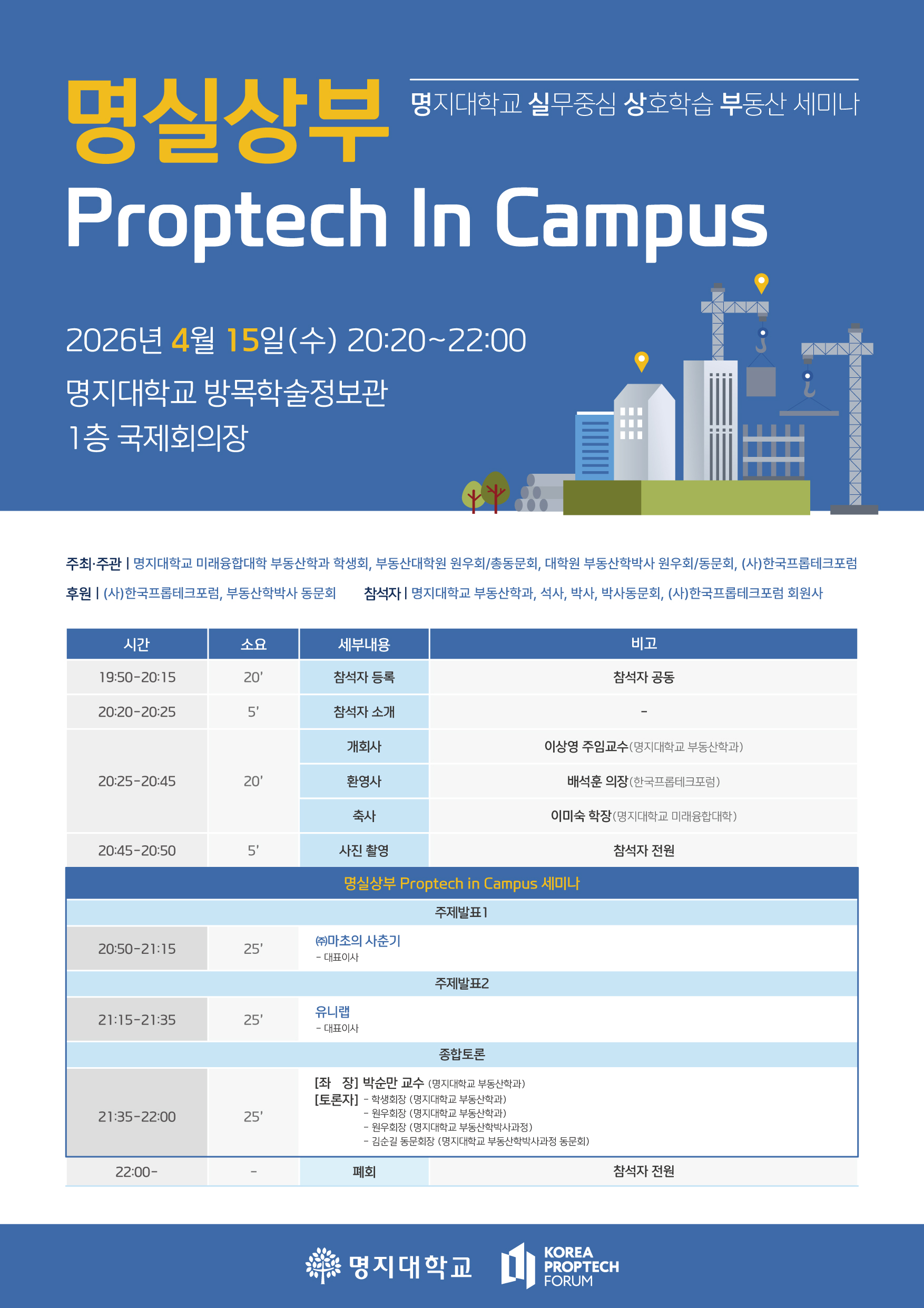 ºÎµ¿»ê »ê¾÷°ú ±â¼úÀÇ À¶ÇÕÀ» ÁÖÁ¦·Î ÇÑ ¡¸¸í½Ç»óºÎ Proptech in Campus ¼¼¹Ì³ª¡¹¸¦ ¾Æ·¡¿Í °°ÀÌ °³ÃÖÇÏ¿À´Ï, °ü½É ÀÖ´Â Çлý ¹× ±¸¼º¿ø ¿©·¯ºÐÀÇ ¸¹Àº Âü¿© ¹Ù¶ø´Ï´Ù.